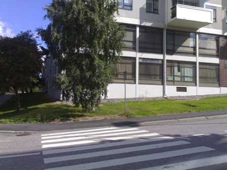 In the next crossing, cross the road and turn left, down Ratamestarinkatu.